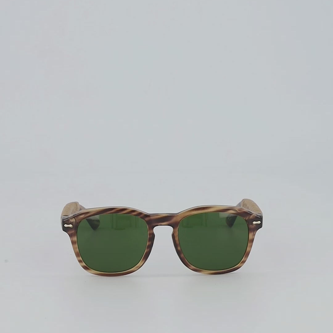 Hailing from Italy, our frame is crafted from an extremely resilient "striped" tortoise Swiss TR90 and fitted with green lenses that reduce light intensity by 75% for an optimal level of comfort in bright environments. Our lenses also provide 100% protection from harmful UVA and UVB rays. Sumptuous braided leatherwork adorns the frame, handmade with the finest sheepskin in Mexico, and designed to fit most head sizes. This sophisticated style is geared towards the modern man.