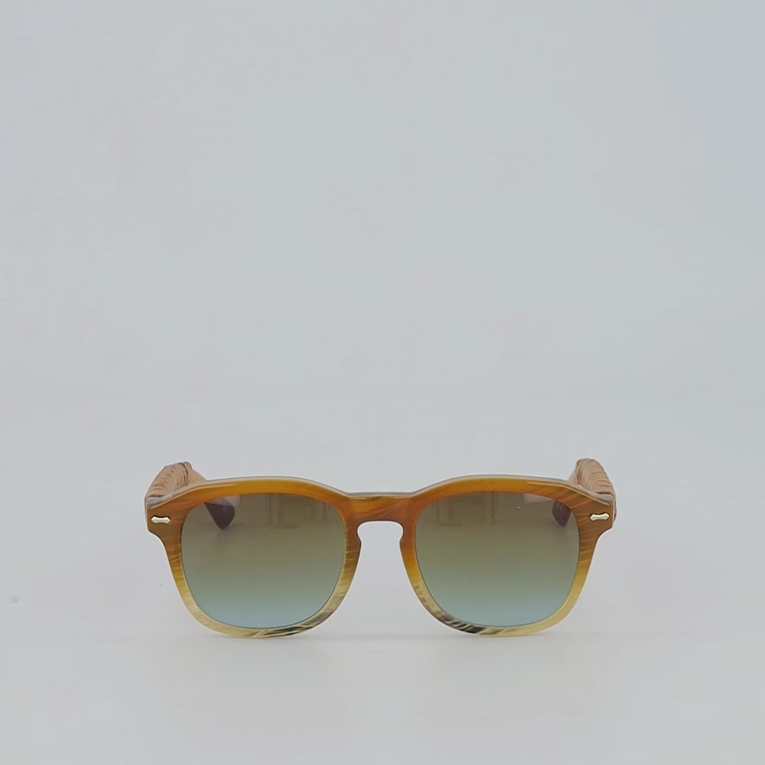 Hailing from Italy, our frame is crafted from an extremely resilient "striped" beige Swiss TR90 and fitted with gradient light blue lenses that reduce light intensity by 70% for an optimal level of comfort in medium bright environments. Our lenses also provide 100% protection from harmful UVA and UVB rays. Sumptuous braided leatherwork adorns the frame, handmade with the finest sheepskin in Mexico, and designed to fit most head sizes. This sophisticated style is geared towards the modern man.